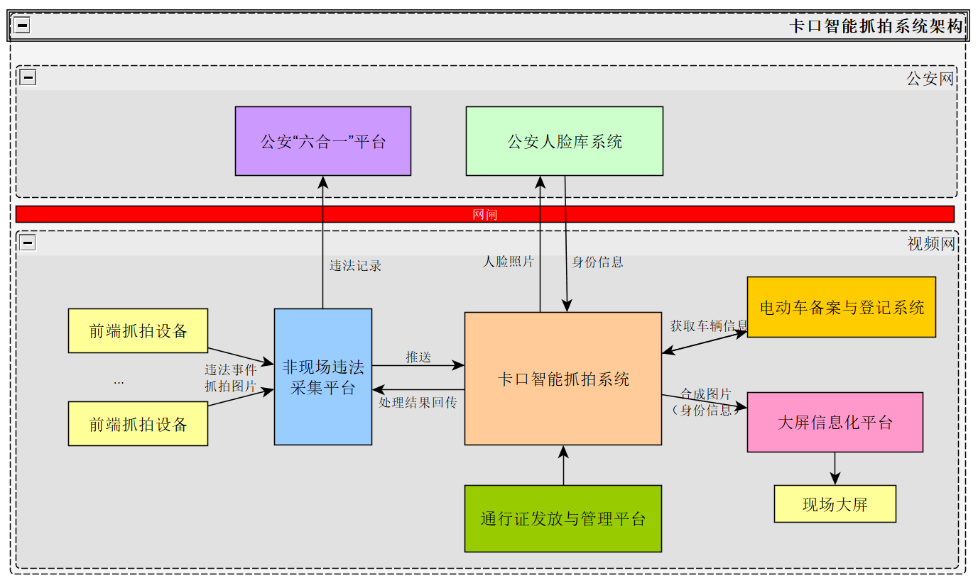 系统整体架构如图所示,其中行人和电动车违法抓拍和认定系统系统由前端行人和电动车违法抓拍设备、后端二次识别和处理系统两大部分构成,并涉及到与违法记录采集与审核平台、公安人脸库系统、电动车备案与登记系统、公安“六合一”平台、大屏信息化平台等多个平台和系统的对接。