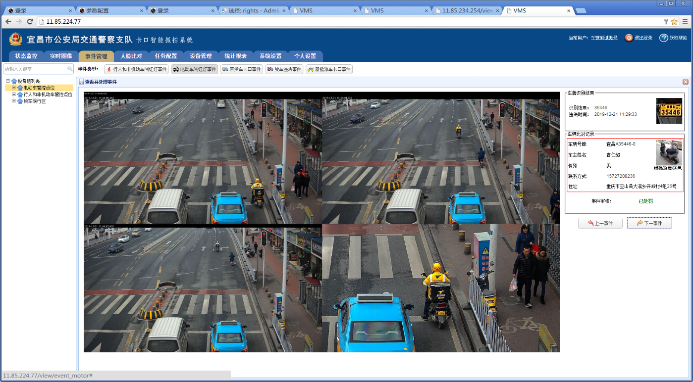 2.电动车闯红灯抓拍,对电动车车牌进行识别并通过电动车登记平台获取车主信息,形成违法记录。